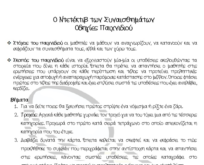 Ο «Ντετέκτιβ των Συναισθημάτων» είναι ένα επιτραπέζιο παιχνίδι που δημιουργήθηκε για να υποστηρίξει τη δράση για τα συναισθήματα και τους νέους φακέλους του ΜτΘ της Γ' τάξης του Δημοτικού. Το παιχνίδι απευθύνεται στους μαθητές της Γ' τάξης. Παίζεται ομαδικά και καθιστά την παρουσία του εκπαιδευτικού συντονιστική και καθοδηγητική. Το περιεχόμενό του είναι συμβατό με τα νέα ΑΠΣ και ΔΕΠΠΣ που αφορούν στο ΜτΘ του Δημοτικού, ενώ παράλληλα αναπτύσσει την ομαδικότητα, την ευχαρίστηση και την κριτική σκέψη. Ο «Ντετέκτιβ των Συναισθημάτων» είναι ένα επιτραπέζιο παιχνίδι που αποτελείται από ένα ταμπλό και 28 κάρτες με διάφορες συναισθηματικές καταστάσεις που μπορούν να συμβούν στο σπίτι, στο σχολείο, στην πόλη και στη φύση.
