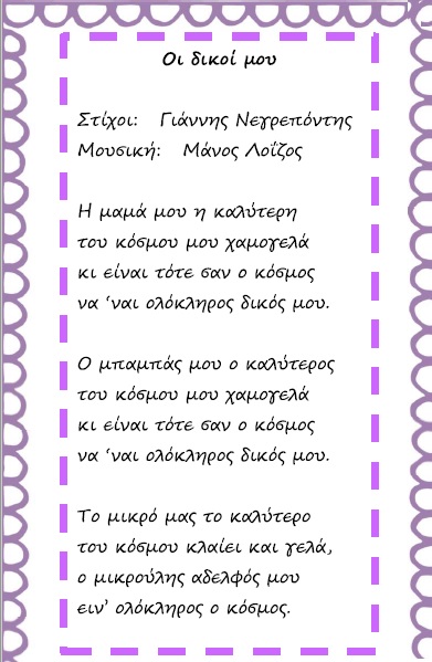 Δόθηκε στους μαθητές το επόμενο φύλλο εργασίας με υλικό που προτείνεται για τη διδακτική του νέου φακέλου του μαθήματος των Θρησκευτικών. Οι μαθητές επεξεργάστηκαν το τραγούδι με τίτλο "Οι δικοί μου" σε στίχους του Γιάννη Νεγρεπόντη και μουσική του Μάνου Λοΐζου. Αφού διάβασαν τους στίχους προσεχτικά, μίλησαν για τα συναισθήματα που νιώθουν τα μέλη της οικογένειας αυτής. Στο τέλος ζωγράφισαν τη δική τους οικογένεια σε μια ευτυχισμένη στιγμή, ακούγοντας το τραγούδι, με τη φωνή της Τάνιας Τσανακλίδου.